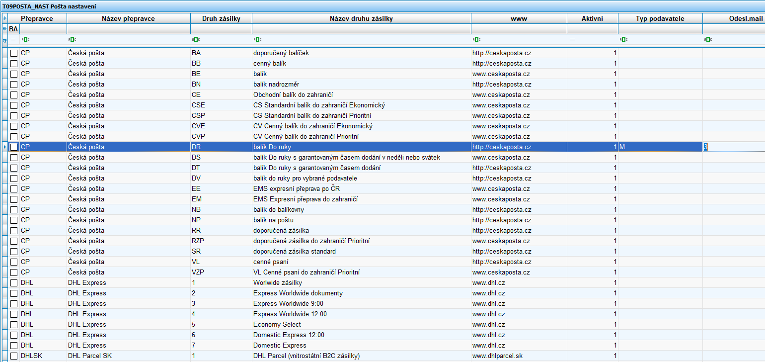 · Číselník T09POSTA_NAST – číselník parametrů odeslání dle přepravců