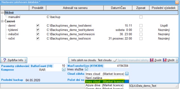 V menu Archivace a obnova/Archivace a zálohování je nová možnost Cloud záloha. Lze nastavit záloha do IMES Cloud, Azure Drive, Google drive. Vždy musí být zatrženo Imes služba.