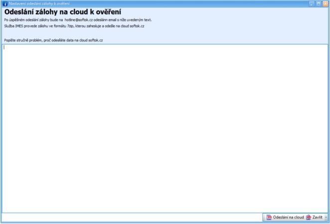 V menu Nápověda/Záloha databáze do cloudu k ověření. Zobrazí se formulář ve kterém se popíše problém, proč se záloha odesílá. Program v plánovači po odeslání nastaví úlohu ZAL na odeslání dat a služba IMES následně vytvoří zálohu ve formě 7Zip a odešle na náš cloud. Po odeslání zálohy do cloudu, bude odeslán mail na hotline@softok.cz s informací o odeslání zálohy a s popsaným popisem