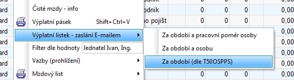 Výplatní lístek – zaslání E-mailem, které má podmenu: